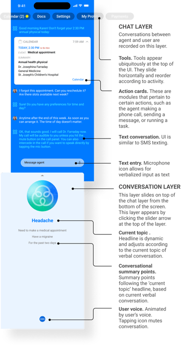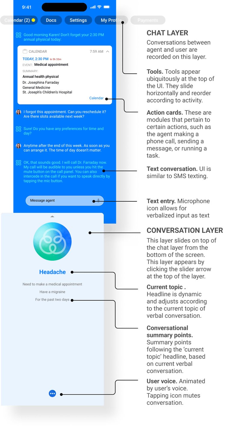 Sutra Sphere's agent UI has two layers: a persistent text chat that logs all interactions, and a dynamic voice interaction layer that slides over it. The voice layer adapts in real time, displaying relevant content based on the conversation. The text chat layer allows for chat input and also serves as a continuous activity log, ensuring all exchanges and activities—spoken or typed—are preserved for reference.